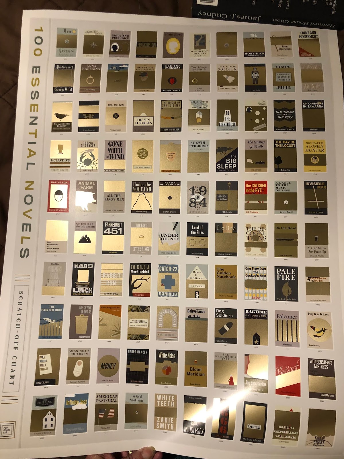 This is the scratch off chart I got for Christmas from my daughter. It is 100 Essential Novels. I have already scratched off 3, Jane Eyre, Wuthering Heights and 1984 but that’s because I just read them in the last few months. There are others on here I have read before but I’m not going to scratch them until I read them again. Some of them I’ve never heard of. Pretty sure it’s going to take me more than one year to read all these. I know a few of them are long ones.
