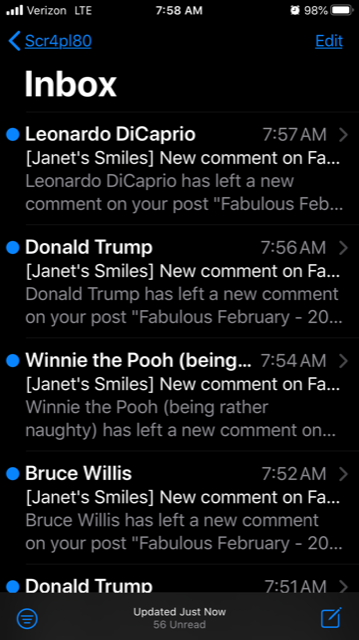 Now, the ones from DT I would have deleted as spam immediately anyway but after I took this screenshot, Tom Cruise, Kirk Douglas, Burt Lancaster and Jacob Marley also stopped by my blog to leave me comments!  These were on my Blogger site and unfortunately Blogger is not as efficient as WordPress at weeding out these crazy people.  It was too hard for me to navigate on my phone so I had to wait until I got home to handle this mess.