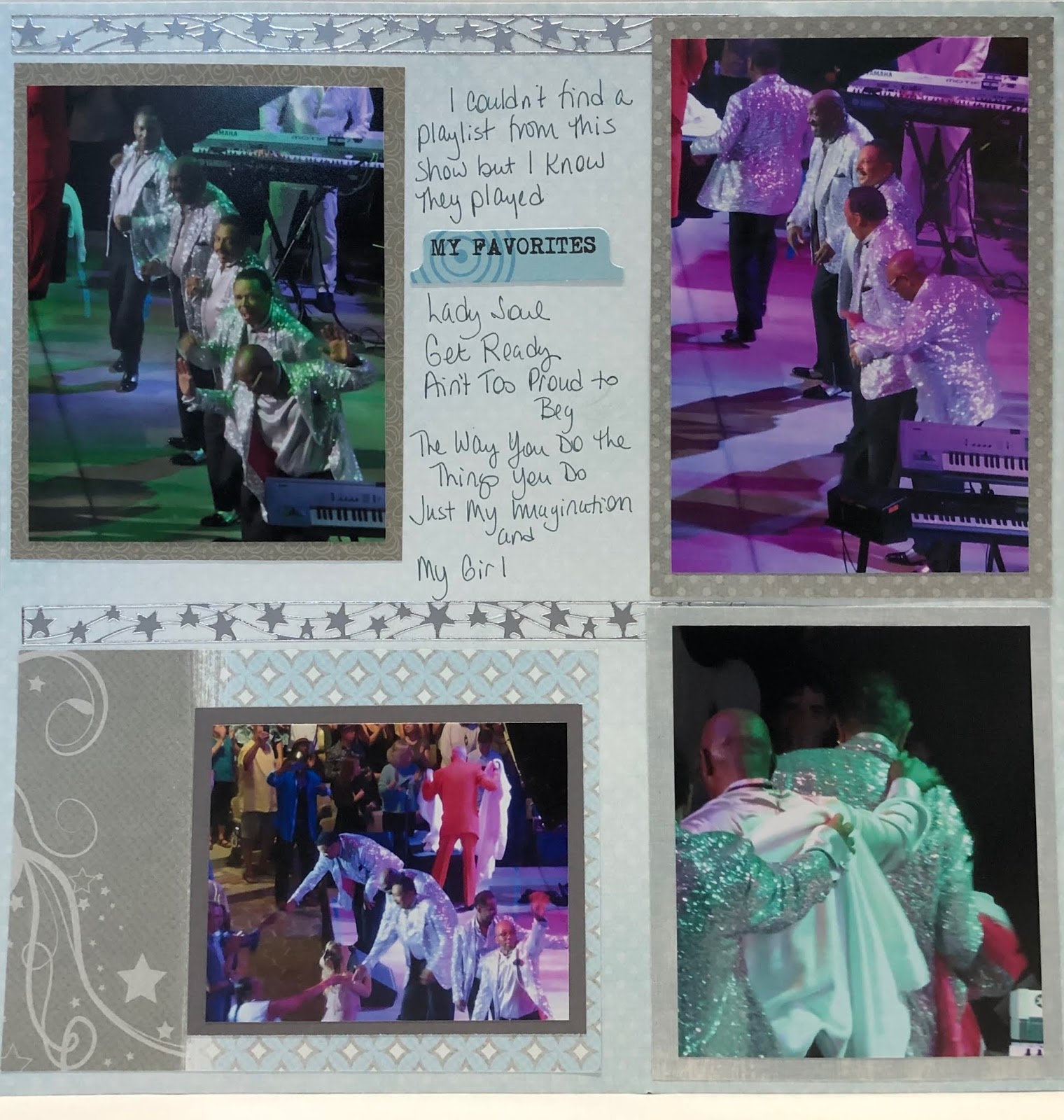 The premise of the A to Z Challenge is that you write a post with the corresponding letter of the alphabet in mind. My theme for this year is to show the scrapbook pages I’ve made of bands we have seen. In 2017 when I did the same theme, I used Genesis as my “G.” We didn’t see any other “G” bands so I’m using the name of a song that starts with the letter “G,” – Get Ready by the Temptations. I have another band that I want to use for “T.”