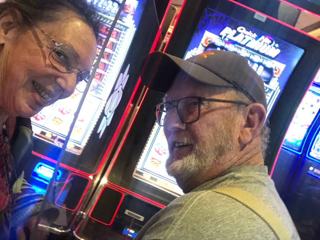 Lots of fun here! I know all about the husband and golfing. Mine, too. I tried a time or two but nope, wasn’t for me, but driving the cart was fun. We’ve only been to one gambling casino in Las Vegas. Noisy, but fun. Now geocaching I’ve done once here in town with my daughters. We found it and signed our names on the little card. It was fun! 🙂