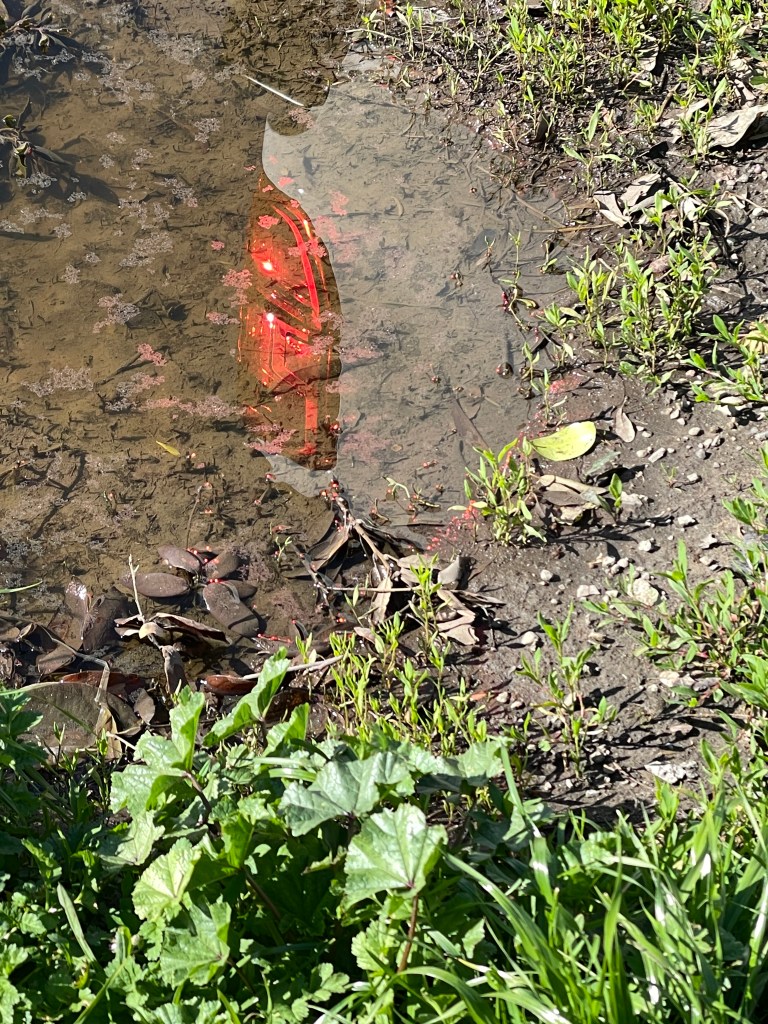 This is a reflection of the tail light of my husband’s truck in a puddle by the curb.