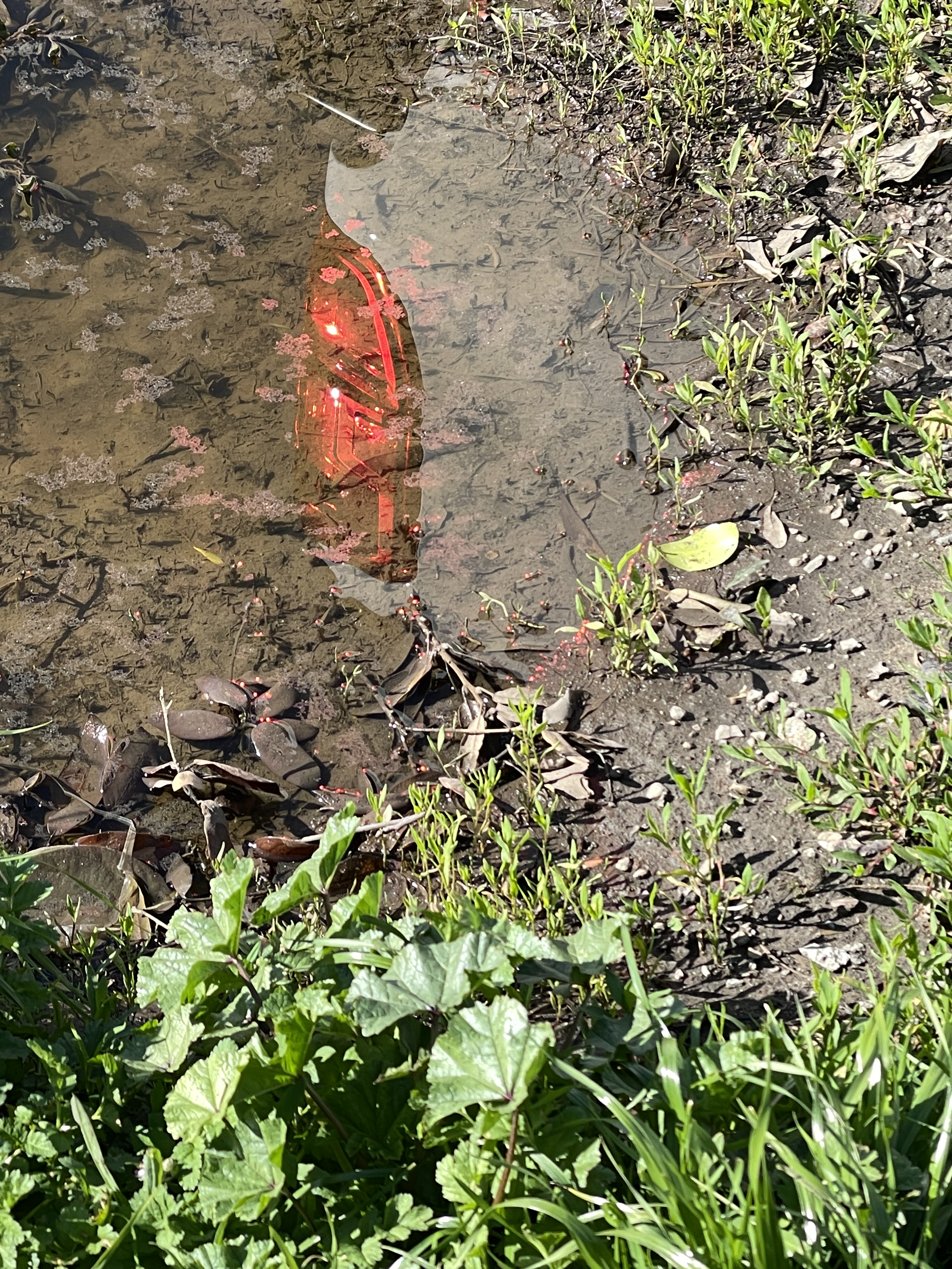 This is a reflection of the tail light of my husband’s truck in a puddle by the curb.